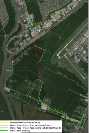 At present, there is no bridge along Peters Road to cross the Gulf Intracoastal Waterway (GIWW). The Peters Road Extension will extend over the GIWW with the construction of a bridge, connecting with Walker Road. Walker Road connects to the main entrance of the Port and the Mississippi River via LA 23.